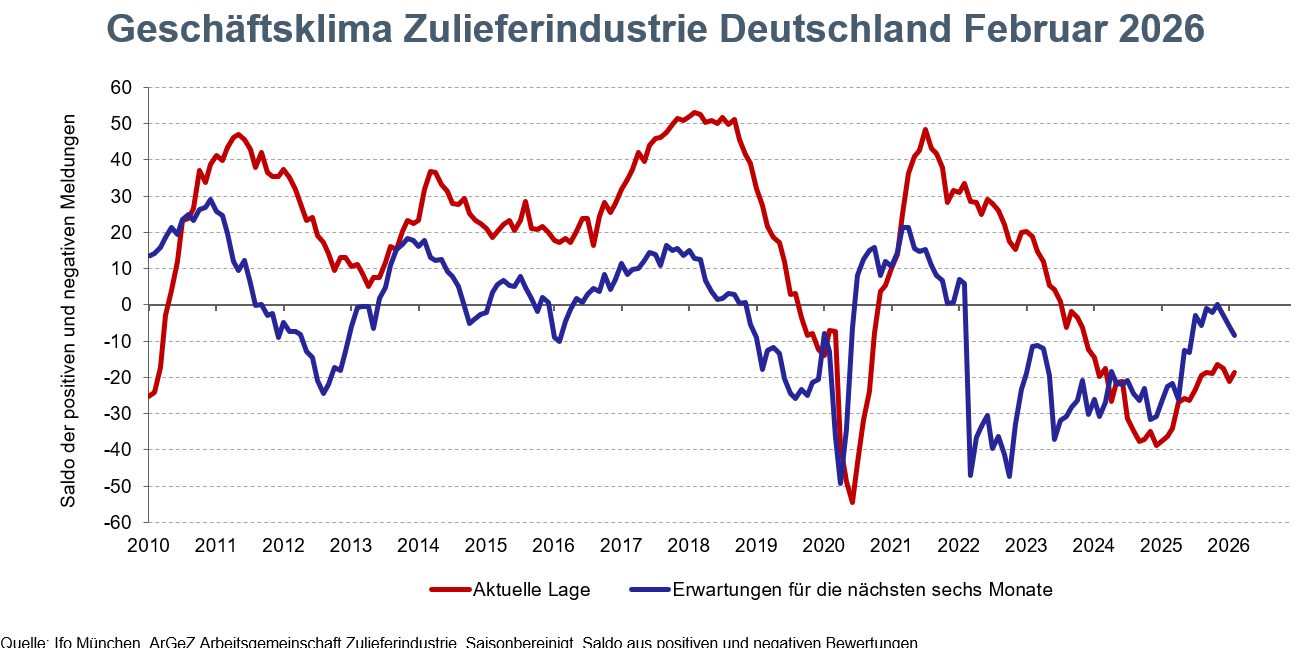 Das saisonbereinigte ifo-Geschäftsklima der deutschen Zulieferindustrie zeigt sich im Februar nahezu unverändert. Mit einem Wert von -13,7 Saldenpunkten liegt der Index minimal über dem Januarwert von -13,8 Punkten. Damit setzt sich die seit Jahresbeginn beobachtete Stabilisierung auf niedrigem Niveau fort.