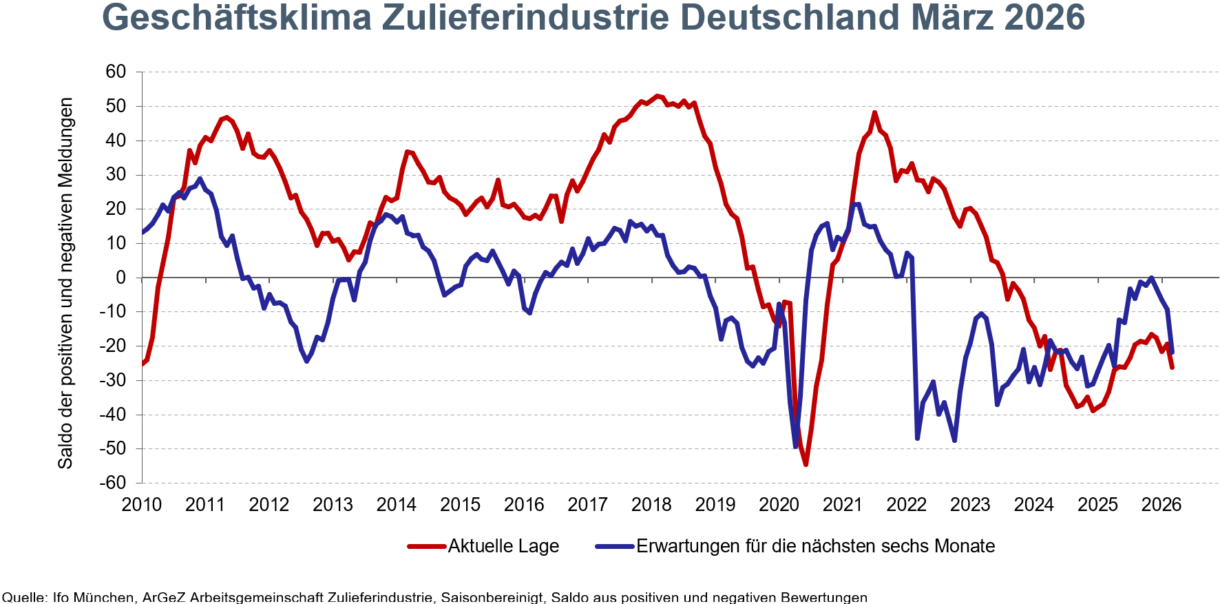 Das saisonbereinigte ifo-Geschäftsklima der deutschen Zulieferindustrie ist im März 2026 deutlich gesunken. Der Saldo fiel von -14,4 Punkten im Februar auf -24,1 Punkte im März. Damit wurde die zuvor angedeutete Stabilisierung abrupt unterbrochen. Zugleich markiert der aktuelle Wert den schlechtesten Stand seit genau einem Jahr.